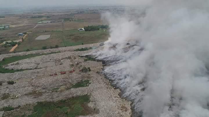 Celui-ci aurait débuté dans plusieurs foyers répartis dans la décharge et consume le site entier. Le vent a grandement participé à sa propagation, et la présence de briquets, de cosmétiques, ou de verre, contribue à son alimentation. Les pompiers se retrouvent ainsi dans une situation délicate, obligés de marcher sur des montagnes de déchets qui peuvent à tout moment s’effondrer.